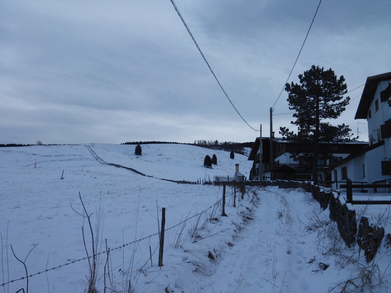 Lasciata la macchina, proseguiamo nella strada asfaltata verso località Bertigo, per poi girare subito a destra nella prima stradina che incontriamo. Quindi seguiamo la via e appena possibile iniziamo la salita affiancando alcune case ed il recinto spinato che delimita prima a sinistra e poi ambo i lati gli spazi aperti. In prossimità del gruppo di alberi non giriamo a sinistra, come sarebbe tracciato dalle indicazioni, ma proseguiamo dritti (in salita).