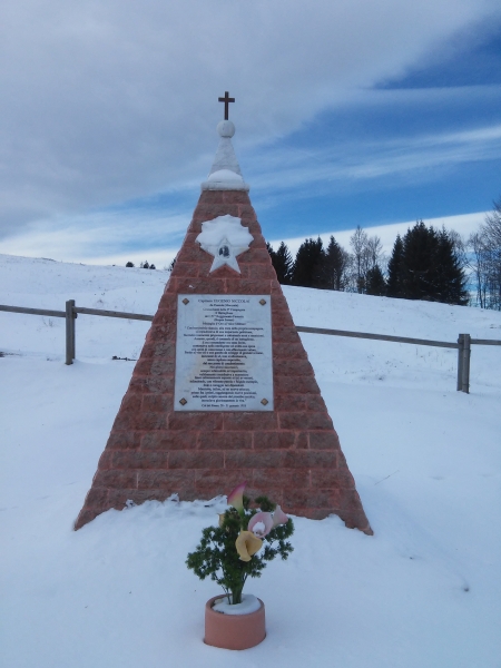 Giriamo a sinistra solo quando finisce il bosco; seguiamo quindi in discesa i piloni dei vecchi skilift. Affianchiamo quindi malga Melagon e raggiungiamo l’inizio dello skilift opposto. Continuiamo quindi il sentiero ed al bivio manteniamo la destra, proseguendo dritti. Tra l’altro affianchiamo gli impianti sciistici di risalita ancora in uso di Valbella ed un monumento a forma piramidale in ricordo del capitano Eugenio Niccolai, morto a Col di Rosso il 31 gennaio 1918.